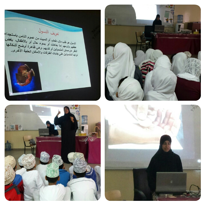 مسرحية عن ظاهرة التسول قدمها طلاب الصف الرابع تحت اشراف اخصائية الأنشطة المدرسية ( أ .أمل الربيعي ) والاخصائية الاجتماعية ( أ. دلال البلوشي)