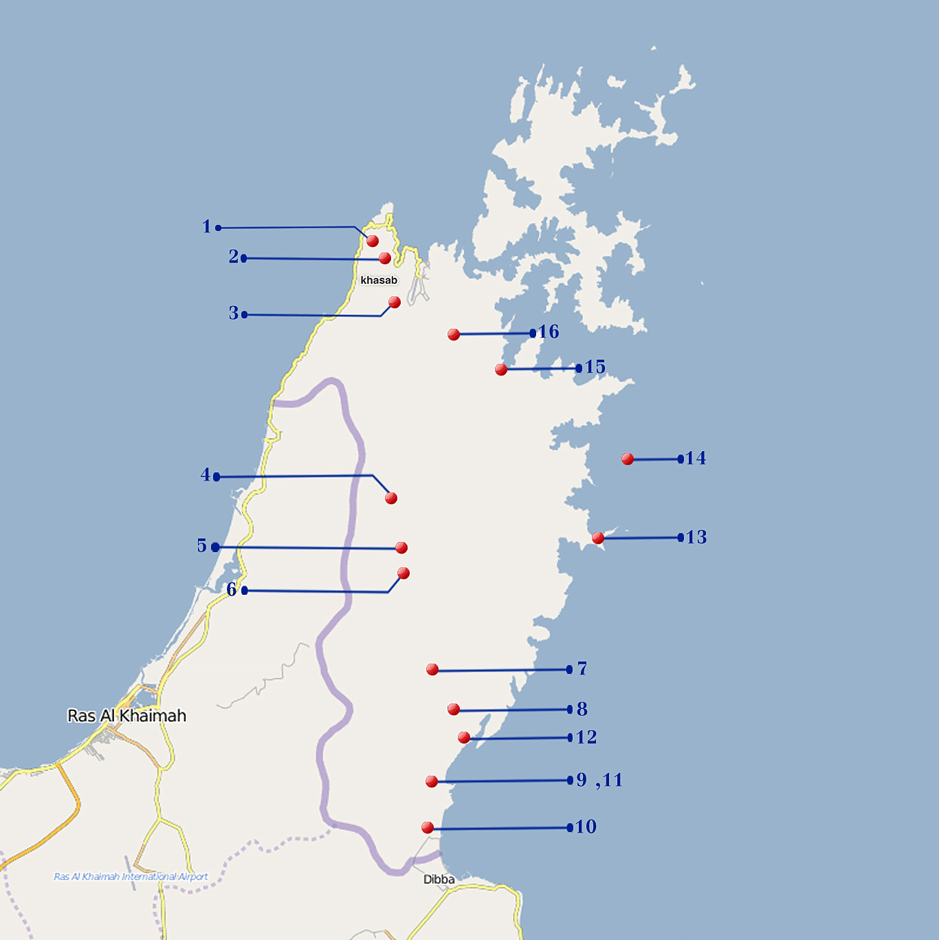 15 – إطلالة من على سفح جبل خور النجد أحد أكبر الأخوار في محافظة مسندم ، حيث يطل الزائر على منظر بانورامي للخور من ارتفاع 420 متراً يتمازج فيه البحر والجبل بمنظر مهيب.