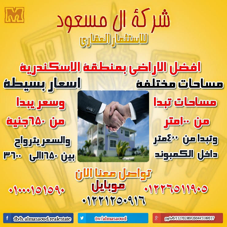 اراضى للبيع بالاسكندرية مساحات مختلفة تقع بمنطقة اسكندرية شوارع متسعة على الطريق الدائرى بالقرب من كارفور والداون اراضى داخل حيز عمرانى امكانية البناء مباشرا افضل الاراضى والمساحات بالاسكندرية