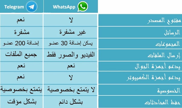 ويتميز برنامج تليجرام بالعديد من المميزات جعلت منه البرنامج المفضل لتواصل مع الاصدقاء ولعل اهمها مشاركة رسائل النصية وارسال الصور والملفات بجميع الانواع متل الفيديو والكتب و المستندات وهى ميزة غير متوفرة فى الواتس اب وانه يقوم بإرسال واستقبال رسائل بسرعة عالية مقارنة بالبرامج الاخرى ومن المميزات الاخرى لي برنامج تلجرام انك تستطيع استخدام اسم مستعار بدل رقم الهاتف للبحت عنك فى اي مكان اخر وتستطيع تشكيل مجموعة حتى 200 شخص والكتير من المميزات الاخرى منها انه يدعم جميع الاجهزة متل الكمبيوتر والتابلت وهواتف سامسونج التى تعمل بنطام اندرويد وهواتف الايفون ويدعم ايضا برنامج telegram وانطمة التشغيل متل الويندوز بجيمع اصدارته وايضا هواتف الويندوز فون