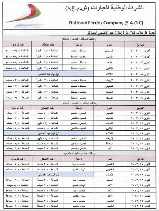 جدول رحلات عبارات الشركة الوطنية للعبارات خلال إجازة عيد الأضحي لخطوط #مسقط و