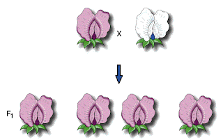 4- جمع مندل البذور الناضجة من النباتات ذات الازهار الوردية وذات الازهار البيضاء والناتجة عن التلقيح الخلطي ، ثم زرعها في موسم جديد .ولاحظ الوان الأزهار في النباتات الجديدة بعد إكتمال نموها فوجد ان لون الازهار في جميع النباتات الناتجة كان ورديا، واعتبرت هذه النباتات أفراد الجيل الاول (F1) واستنتج ان ازهار افراد الجيل الاول وردية اللون سواء كانت الامهات تحمل ازهارا وردية اللون او بيضاء.