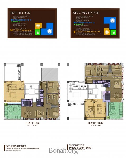 5- أما عن"الفراغات التشاركية" فالهدف منها إعادة الارتباط بين (الجيران) ليكون الرابط إنسانيا لا وظيفيا فحسب (مجرد السكن)، ولذلك فهي تصل بين أدوار المبنى كلها ويتشارك الجميع فيها، وهي تختلف وتتنوع من طابق إلى آخر, فالطابق الأرضي يحتوي على "المضيفة" وهي تحتوي على فراغ استقبال للضيوف مزدوج الارتفاع “double height" وفراغ طعام كبير وجلسات أخرى بالحديقة الأمامية، وأما الطابق الأول فتوجد به "مكتية " ويستوعب أيضا أنشطة المذاكرة والمحاضرات الصغيرة وهو أيضا مزدوج الارتفاع وبه "ميزانين"، أما الطابق الثاني فيحتوي على "صالة عرض"بشاشة كبيرة مزدوجة الارتفاع وبها "ميزانين"، والطابق الثالث به "غرفة ألعاب" تستوعب بعض الأنشطة الترفيهية والموسيقية و ما شابه ذلك، وبالنسبة لطابق السطح فهو "فراغ مفتوح" يحتوي على جلسات مظللة ومطبخ ومكان "للشوي" وغرفة مبيت ضيوف، وأخيرا طابق البدروم يحتوي على "حمام سباحة " بالإضافة إلى صالة "جيم" وجلسات مطلة على حديقة خلفية كبيرة.