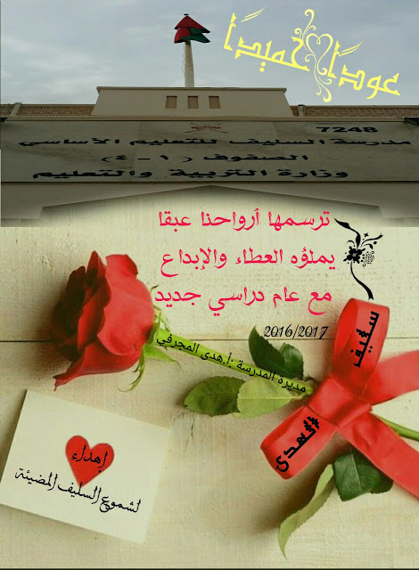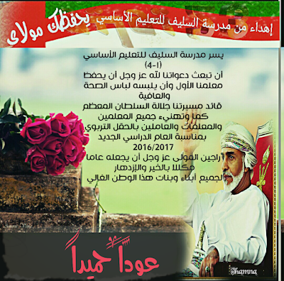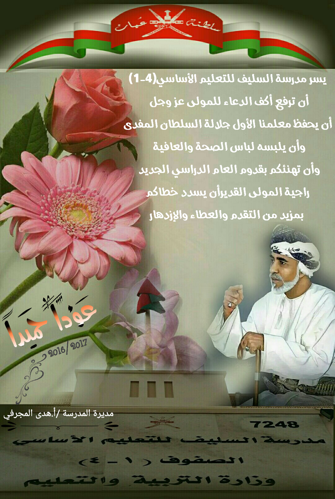 يسر مدرسة السليف للتعليم الأساسي(1-4)أن ترفع أكف الدعاء للمولى عز وجل أن يلبس معلمنا الأول جلالة السلطان لباس الصحة والعافية وأن يبارك بعمره كما يسرنا أن نهنئ جميع العاملين بالحقل التربوي بمناسبة العام الدراسي الجديد 2016/2017راجين المولى عز وجل أن يجعله عاما مكللا بالنجاح والعطاء والإنجاز