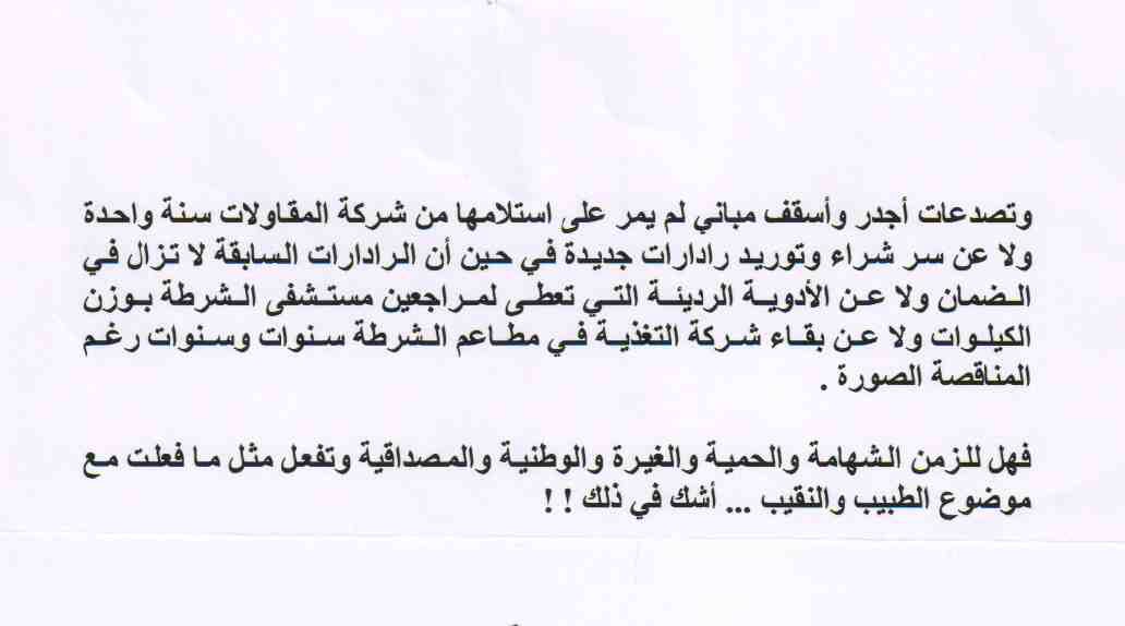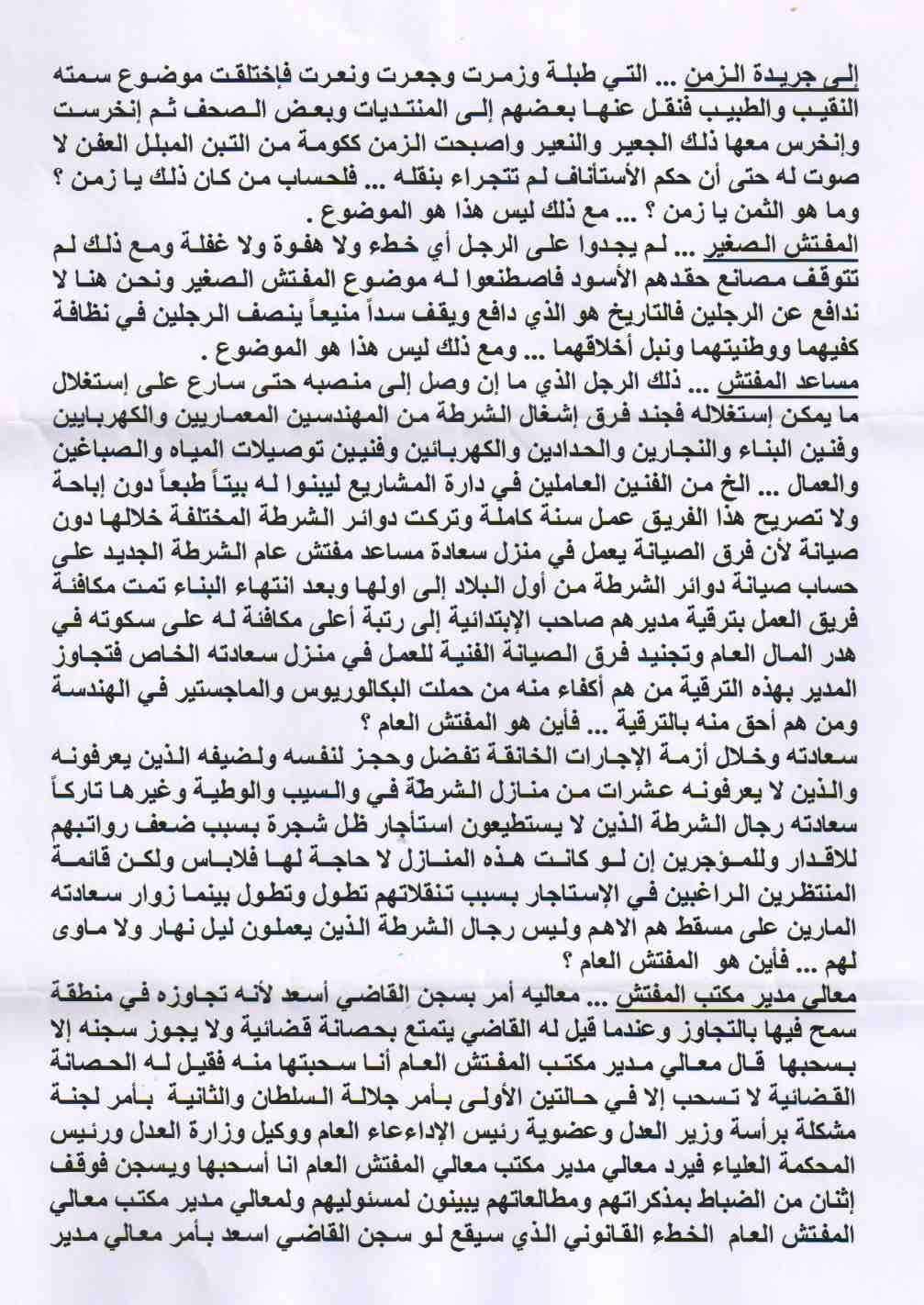 سأروي لكم قصة كنت قد عايشتها وقت حدوثها, فقبل أكثر من ثلاثة سنوات قام أحد ضباط الشرطة بزيارة المفتش في منزله مستفيداً من قرابته ودمه مدخلاً ليفاتحة بدلائل قاطعة ورسمية تؤكد فساد هذا العميد ومن يأتمرون بأمره من فاسدي الشرطة, إلا أن المفتش العام لم تعجبه هزات كرسي المساج الأسود الجالس عليه في غرفة استقبال الضيوف عندما كان هذا الضابط القريب يبلغه بما لا يعجبه لتثور ثورته ويغضب ويقول: دع الملك للمالك. ليدع ذلك الضابط الغيور على مال بلده الملك للمالك وللهالك وللهاتك ولكل فاسد آفك ولكل مال إلى جيوبهم سالك ليقول في نفسه -وهنا أعتقد أنه قال ذلك- مالي وما علي عمان تربي غبونها.